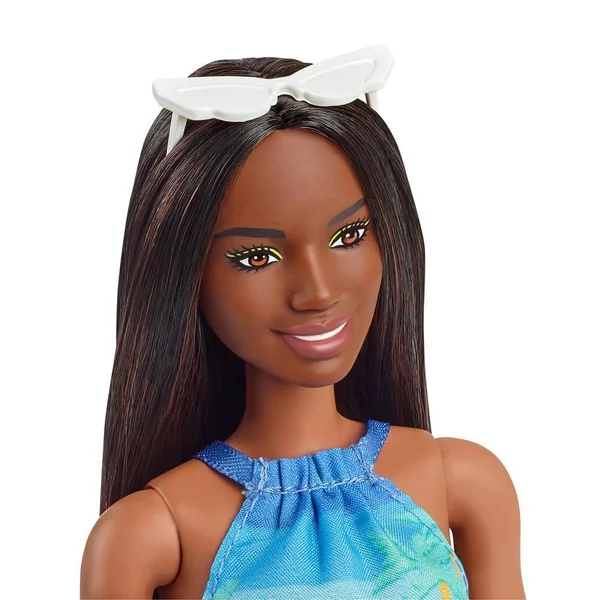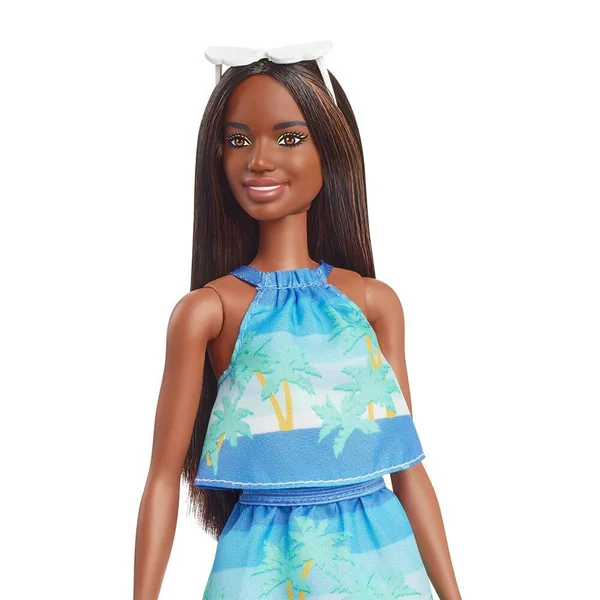 Avec son imprimé palmiers et rayures très tendance, la tenue deux pièces de Barbie brune est aussi fabriquée dans un tissu à base de plastique recyclé.