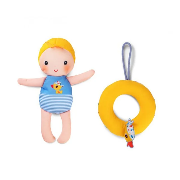 Cette poupée en polyester de 18 cm rendra l’heure du bain encore plus amusante ! Autour de sa taille se trouve une bouée jaune ornée d’une tête de canard.