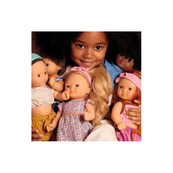 Une belle poupée aux yeux dormeurs, aux cheveux en nylon et vêtue de vêtements amples avec scratch pour faciliter l’habillage.