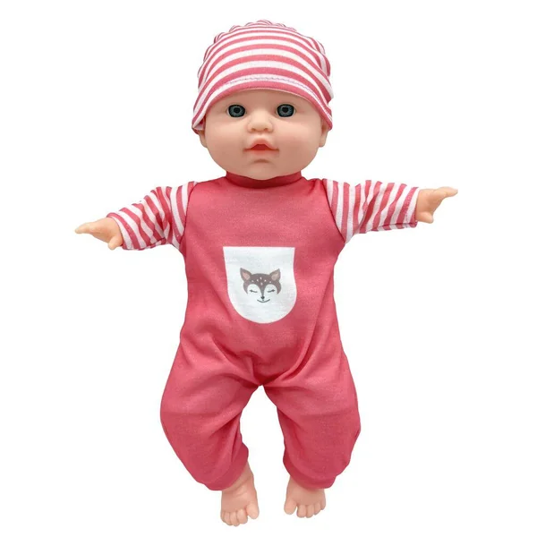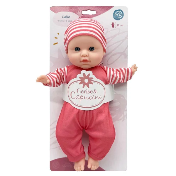 Poupée Calie de 30 cm au corps souple. Prononce 6 sons. Avec un bonnet et un pyjama.