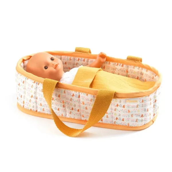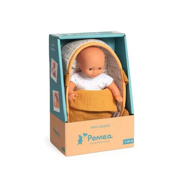 Sasha est un poupon de 20 cm plein de charme aux yeux rieurs. Il a un corps souple et doux imprimé comme un pyjama. Niché dans son adorable petit couffin matelassé au motif élégant, il deviendra vite le compagnon idéal des petits pour être câliné et chéri partout où ils décideront de l’emporter.