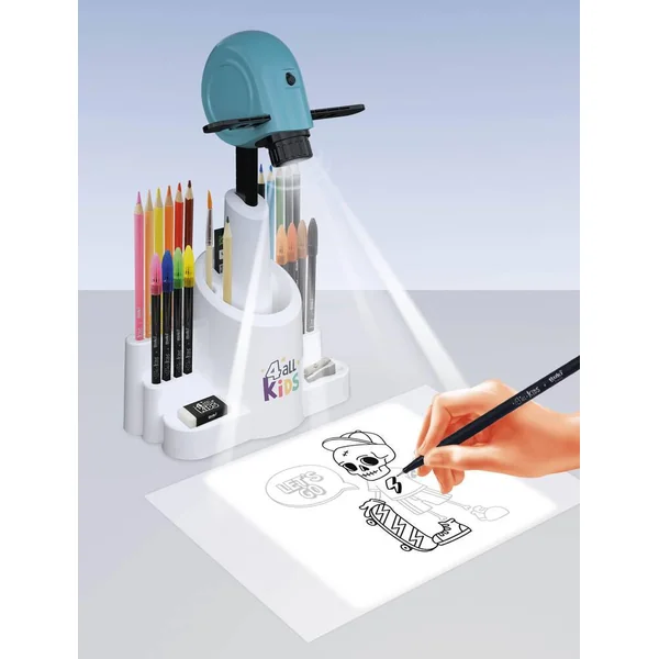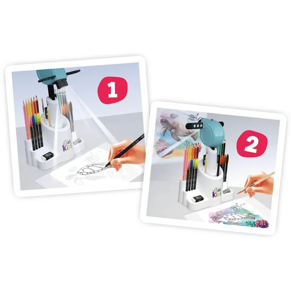 Ce projecteur innovant projette d’abord l’image en noir et blanc sur une feuille pour tracer les contours, puis il projette l’image colorisée pour aider à colorier le dessin. Avec 30 images et 200 motifs à reproduire, les possibilités de création sont infinies. Votre enfant pourra créer ses propres univers et laisser libre cours à son imagination.