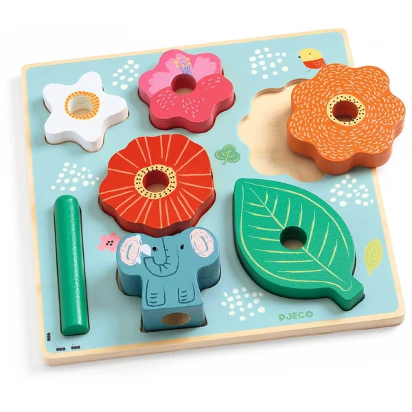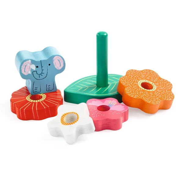 Puzz ET Stack est un puzzle en bois facile à assembler et un jeu d’empilage. Les fleurs s’empilent sur l’axe en bois pour former une jolie pyramide de fleurs avec un petit éléphant sur le dessus.