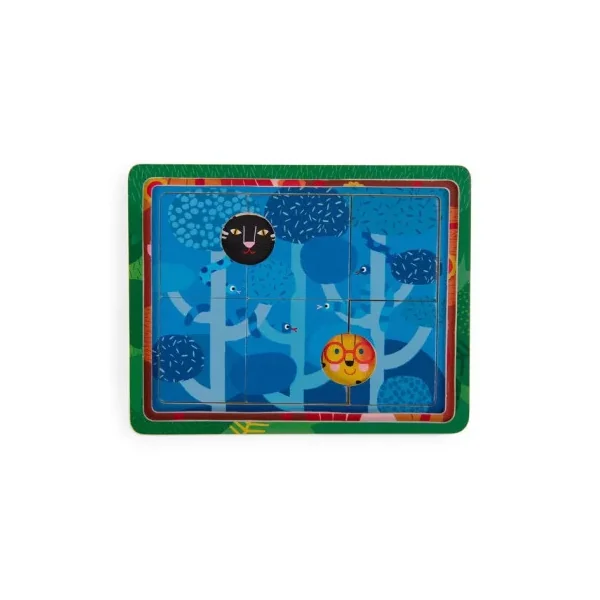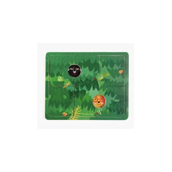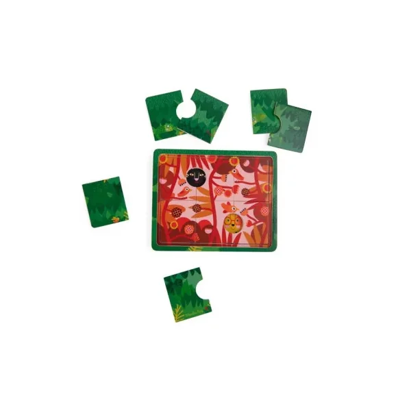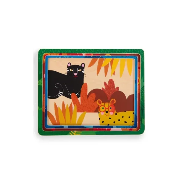 Un puzzle en bois de 6 pièces sur 3 niveaux successifs. Chaque puzzle est associé à une couleur pour faciliter l’apprentissage. Les pièces sont faciles à attraper grâce aux fenêtres. Chaque niveau révèle une histoire dans un nouveau décor Les Toupitis.