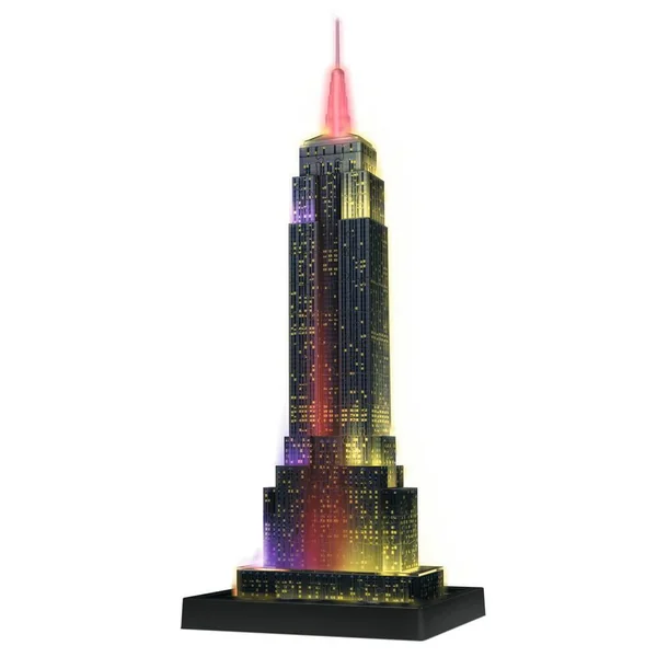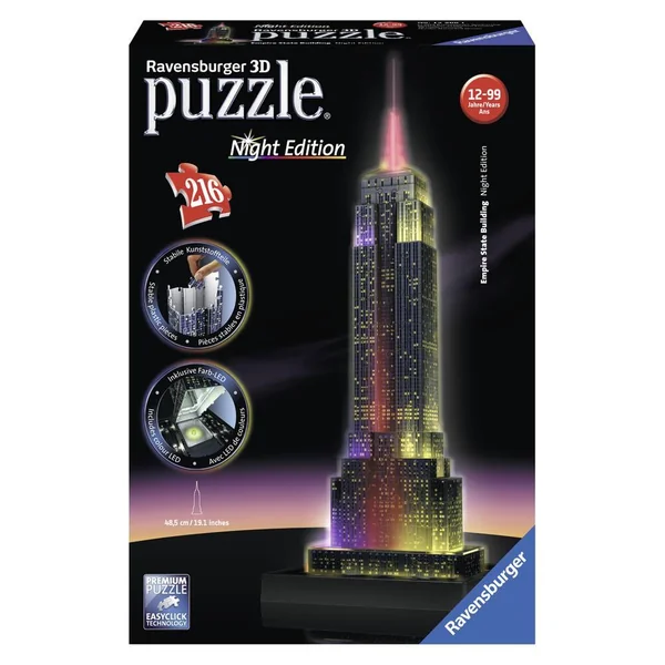 Cette superbe reproduction en 3D de l’Empire State Building est constituée de 216 pièces de puzzles en plastique numérotées, ainsi que d’accessoires uniques pour finaliser l’édifice. La qualité de découpe des pièces -plates, incurvées ou pliables- lui assure une parfaite stabilité, le tout sans colle. Une fois assemblé, l’édifice s’illumine grâce à un éclairage intégré, avec plusieurs modes au choix : blanc tamisé, ou bien avec une alternance de couleurs. Un moyen unique et ludique de re-découvrir ce célèbre monument !
