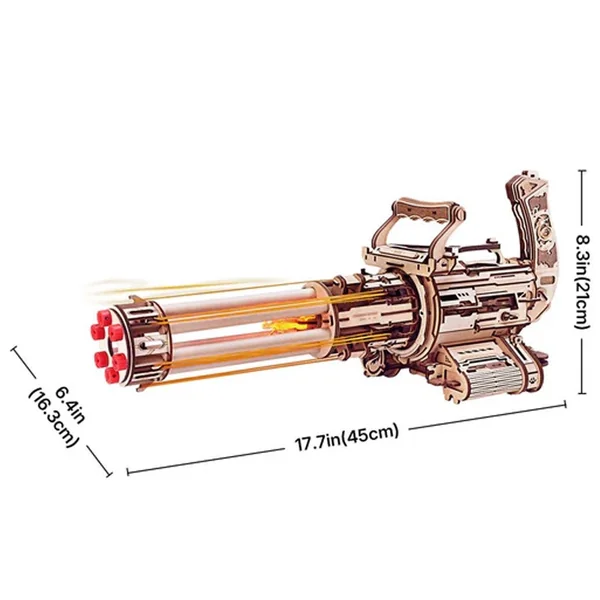 À vos marques, construisez, visez, tirez ! Faites le plein d’adrénaline avec cette arme à deux mains rotative, cliquable et tirante, issue de vos rêves ! La mitrailleuse à canon rotatif ROKR est un puzzle en bois 3D dont le point fort est ses six canons rotatifs pouvant tirer six élastiques chacun. Soit 36 coups à grande vitesse à charger sur le canon rotatif amovible. Inspirée de la XM556, cette merveille apprend aux fans la mécanique des mitrailleuses rotatives sans le poids colossal. Elle évite également de blesser des cibles vivantes grâce à l’utilisation d’élastiques en guise de balles. Devenez votre propre héros d’action et commandez la vôtre dès aujourd’hui !