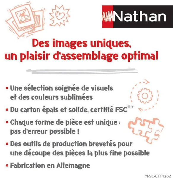 A travers huit collections (Evasion, Urbain, Tendresse, Vie sauvage, Artiste, Nostalgie, Photo d’Art et Mes Héros), Nathan dévoile une sélection raffinée d’images inédites et originales, pour répondre à toutes les envies de puzzle. Forte de son savoir-faire dans le livre, la marque Nathan élabore ses puzzles à partir d’images choisies avec le plus grand soin, pour leur qualité, leur dimension symbolique ou les émotions qu’elles suscitent. Pour les puzzleurs entraînés, le format 1000 pièces est idéal pour profiter de cette activité, propice au calme et à la relaxation.