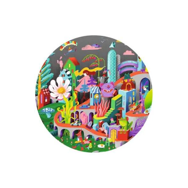 Un puzzle représentant une ville fantastique, où voltigent de drôles de personnages. Un bel univers à découvrir à travers une illustration riche en détails et en surprises.
