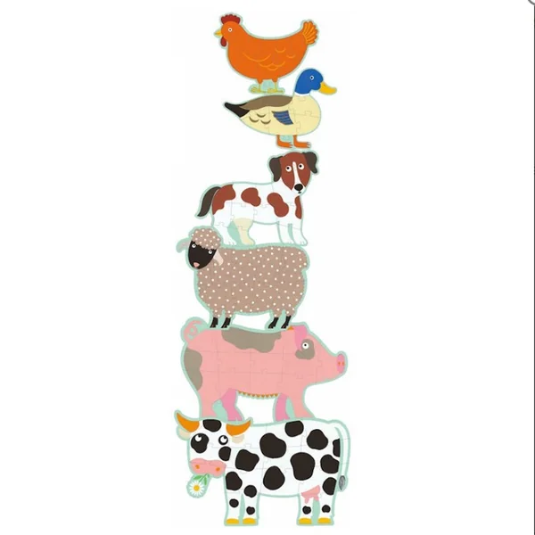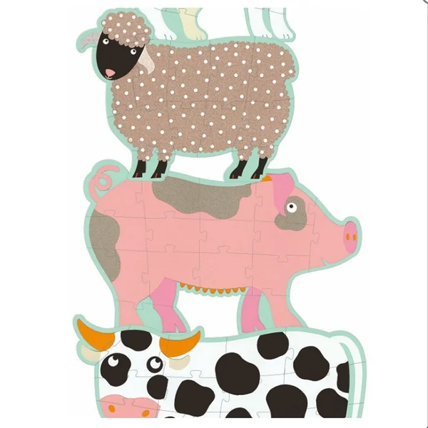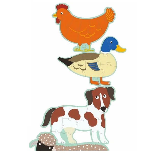 Les puzzles sont de difficultés croissante et facile à manipuler sur le thème des animaux de la ferme : une vache, un cochon, un mouton, un chien, un canard et une poule..