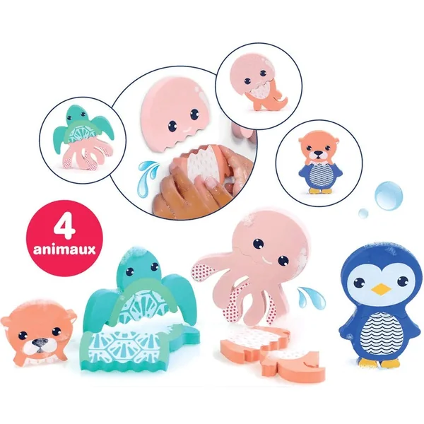 Découvrez ces adorables petits animaux en mousse qui rendront l’heure du bain encore plus joyeuse ! Avec une tortue, une pieuvre, une loutre et un pingouin, ces 4 personnages flottants sont parfaits pour que votre enfant s’amuse tout en se lavant. Leur matière douce et légère assure une sécurité maximale pendant le jeu.
