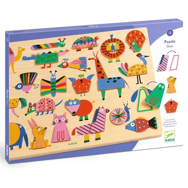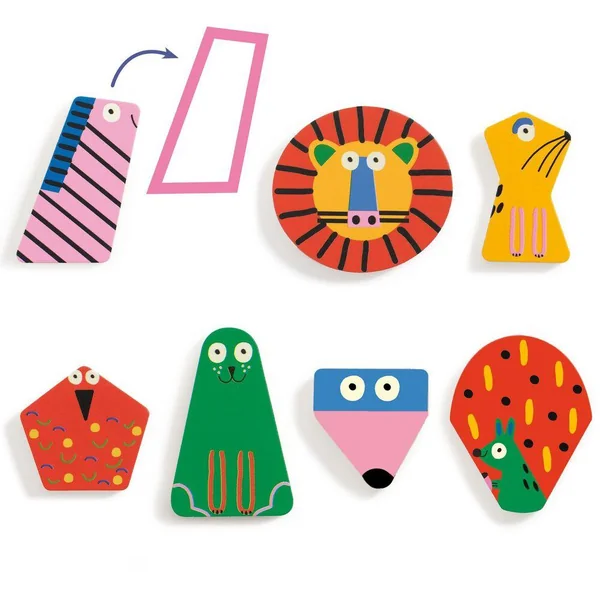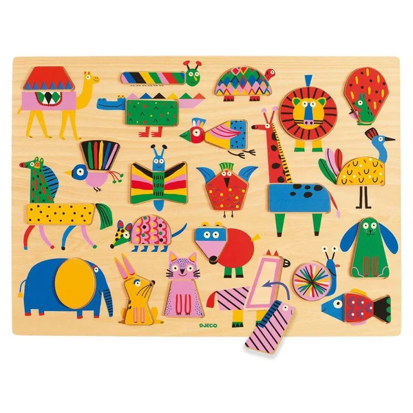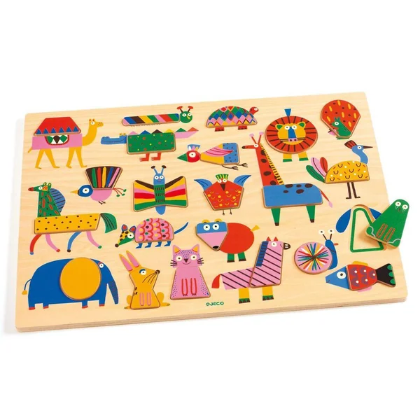 Un puzzle en bois sur le thème des animaux et des formes géométriques. L’enfant place les 22 pièces en reconnaissant sur le plateau les formes géométriques.