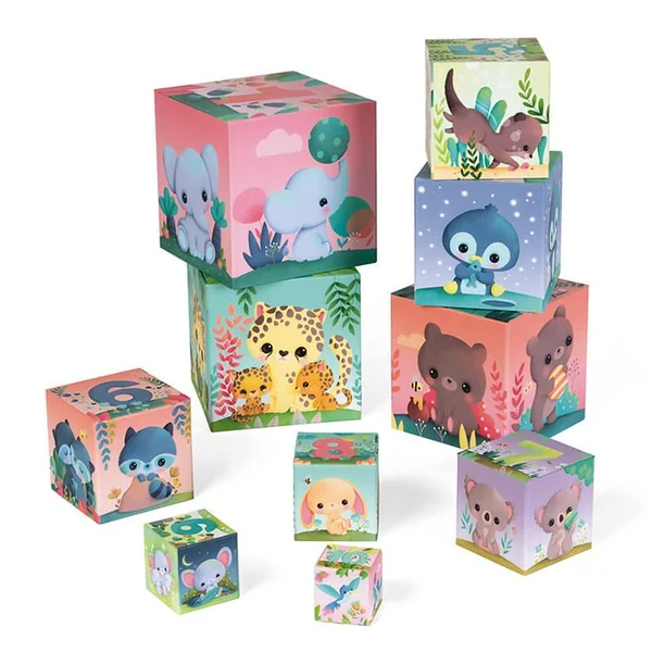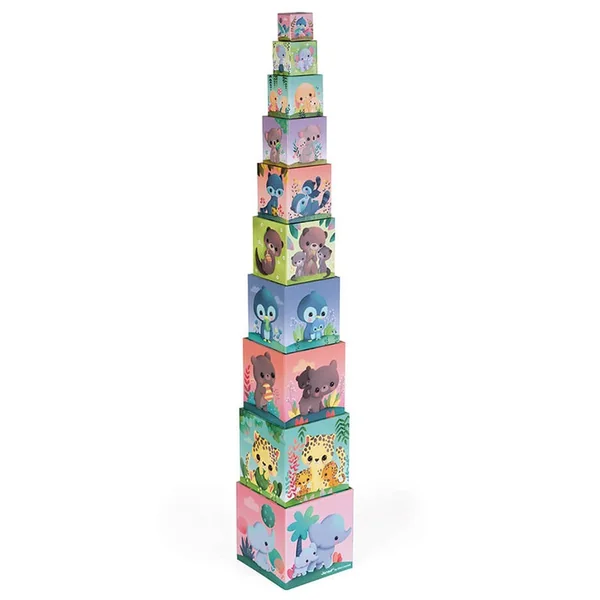 On s’amuse à empiler les 10 éléments, du plus grand au plus petit, pour reconstituer une magnifique pyramide carrée aux couleurs pastel. Le manchot, le jaguar, l’ours, l’éléphant, tous ces mignons petits animaux ne pourront que séduire les enfants avec leurs petits yeux attendrissants et leur délicat bébé.