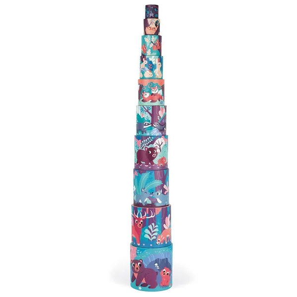 Pyramide en carton pour les enfants de 12 à 36 mois. 10 éléments à empiler pour reconstituer une magnifique pyramide sur le thème des animaux de la forêt. Sur le dessus de chaque élément figure également un chiffre. Avec cette pyramide, votre enfant apprendra à compter jusqu’à 10 et développera sa motricité et son imagination tout en s’amusant !