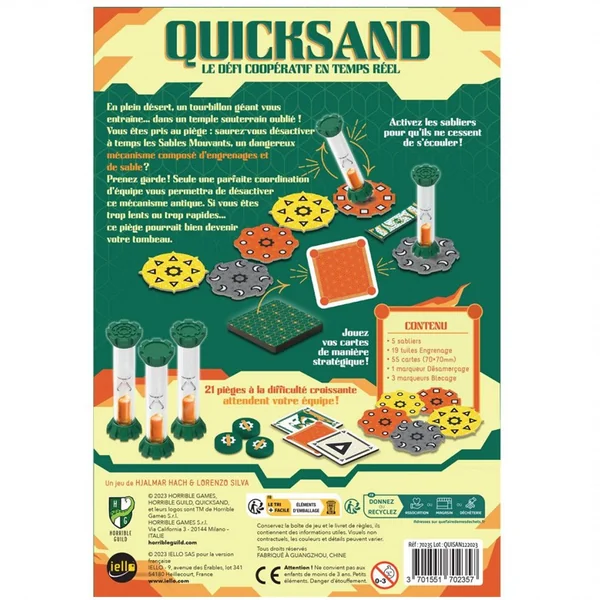 Retourner un sablier trop tôt, c’est risquer de s’attirer des ennuis… mais si vous attendez trop longtemps, vous n’aurez aucun moyen de vous échapper. Vous devrez faire preuve de stratégie et de coordination pour que votre équipe désactive les Sables Mouvants avant que les sabliers ne s’épuisent !