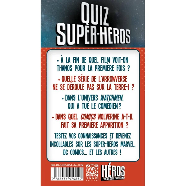 Comment Superman sauve-t-il Lois à la fin du film de 1978 ? Qui a tué les parents de Tony Stark ? Quel super-vilain de DC ressemble à une étoile de mer géante ? Au travers de 500 questions, testez vos connaissances et celles de vos amis sur vos super-héros et vilains préférés, au cinéma, en séries et dans les comics !