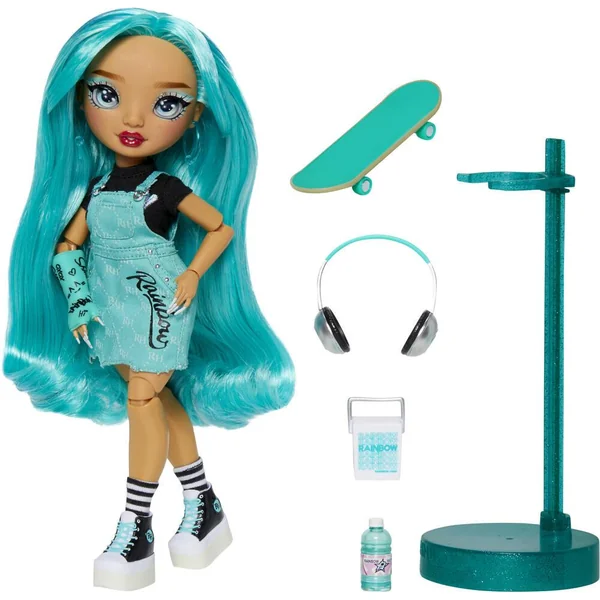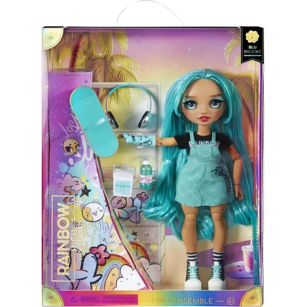 Contient 1 poupée, 1 tenue, des accessoires 1 plâtre de bras, 1 planche à roulettes et 1 socle.