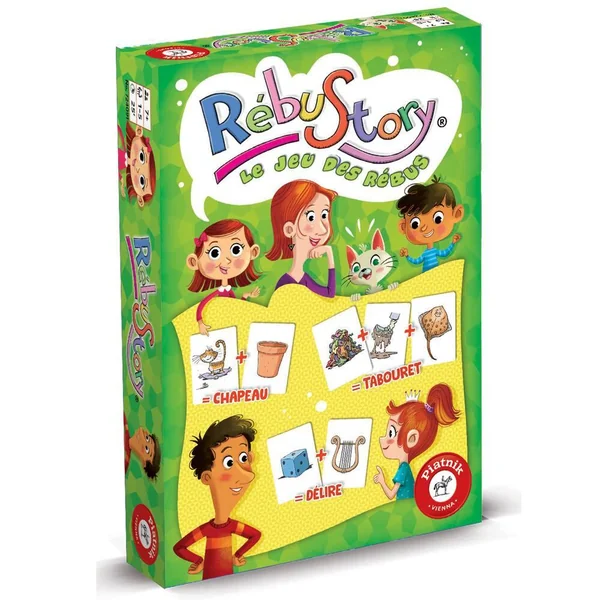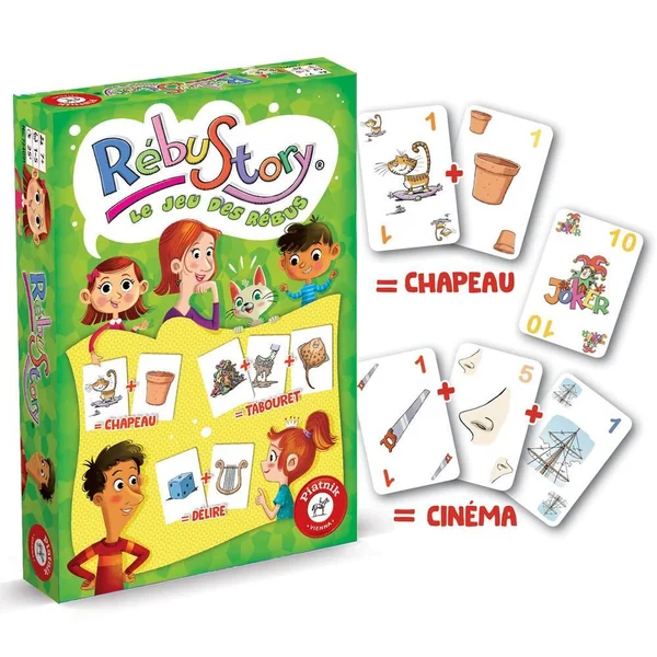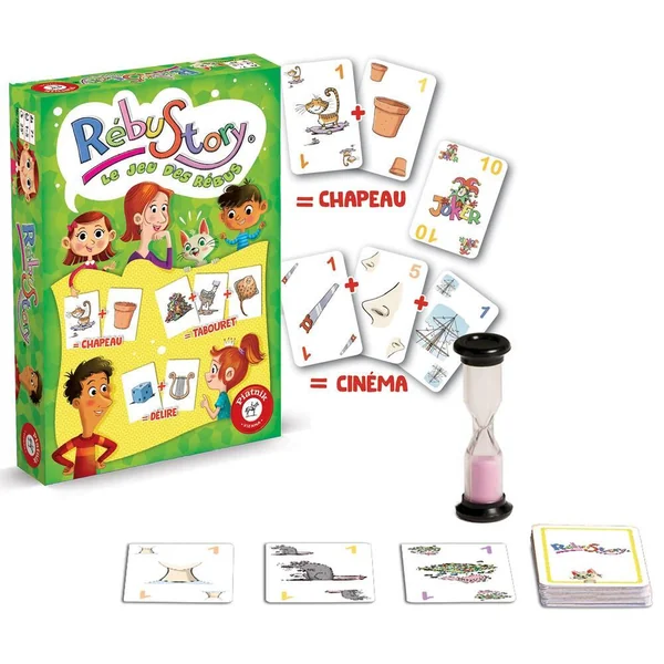 Chaque carte représente une syllabe illustrée. A toi de les agencer pour composer des mots, puis des mots croisés. But du jeu : Former des rébus et être le premier joueur à arriver au score de 300 points pour être sacré vainqueur de la partie. Règle du jeu : Distribue 10 cartes à chaque joueur. A ton tour, récupère une 11e carte et pose autant de cartes que possible en formant des rébus, voir des rébus croisés. Les cartes Joker remplacent une syllabe de ton choix, et la carte Rébustory 2 syllabes ! Plus tes rébus sont longs, plus tu marques de points, tu pourras alors multiplier les points de cartes. Si tu tardes trop, les autres joueurs retournent le sablier et tu n’as plus que 30 secondes pour poser tes cartes. Répioche ensuite pour avoir 10 cartes en main et c’est au tour du joueur suivante. Quand un joueur atteint les 300 points, on finit le tour et le joueur au plus haut score gagne la partie !