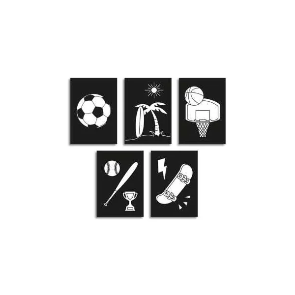 Cette recharge propose 5 planches pré-perforées supplémentaires sur le thème « Sport », avec des illustrations variées telles qu’un ballon de foot, un panier de basket, un skateboard, une balle et une batte de baseball et une planche de surf avec un palmier.
