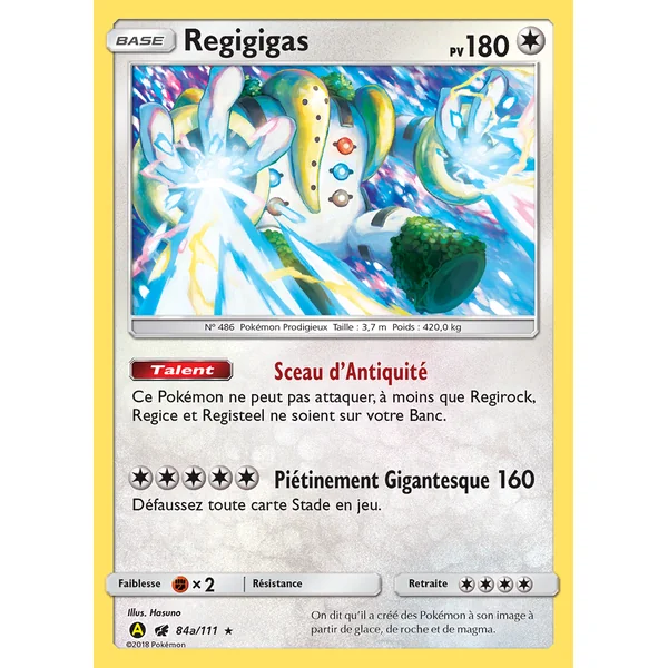 Découvrez Regigigas (cin84a), une carte Pokémon de l’extension Invasion Carmin, provenant du bloc Soleil & Lune. Idéale pour compléter votre collection, cette carte Promo plaira autant aux collectionneurs qu’aux joueurs.