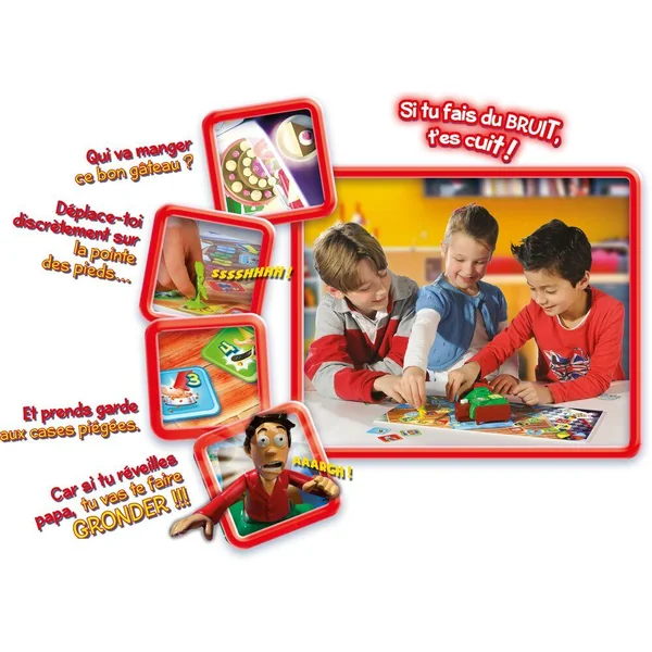 Si tu fais du bruit, tu es cuit ! Sshh Papa est couché dans son lit ! Lance le dé et avance du nombre de cases indiqué. Attention, marche sur la pointe des pieds car si tu tombes sur une case bruit et réveille papa gare au cauchemar !