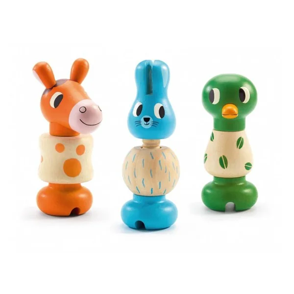 Amuse-toi à visser et dévisser le corps, la tête et les jambes du lapin, du cheval et du canard.