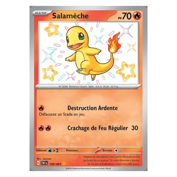 Découvrez Salamèche (paf109), une carte Pokémon de l’extension Destinées de Paldea, provenant du bloc Écarlate & Violet. Idéale pour compléter votre collection, cette carte Shiny Rare plaira autant aux collectionneurs qu’aux joueurs.