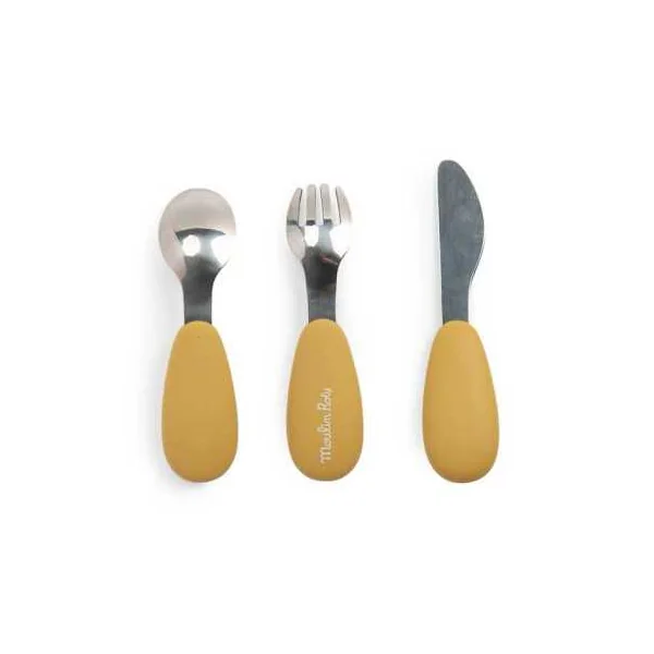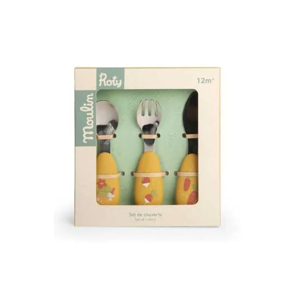 Découvrez le set de couverts en silicone de la collectionTrois Petits Lapins de Moulin Roty, un coffret parfait pour accompagner les bébés dans leurs premiers repas.