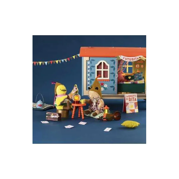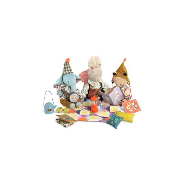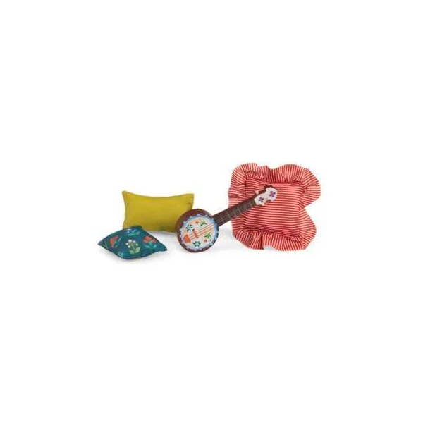 Le coffret comprend : banjo, plaid, lanterne, théière, 2 tasses en bois, 3 livres, 3 coussins. Personnages vendus séparément.