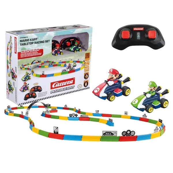 Action, créativité et charme de Mario Kart réunis : il n’y a que dans le nouveau set de course sur table Mario Kart™. Les deux véhicules RC emblématiques de Mario et Luigi, au design détaillé et d’une longueur de 6,2 cm chacun, offrent le plaisir ultime de la course pour les fans à partir de 6 ans. Qu’il s’agisse de reproduire des circuits légendaires de Mario Kart ou de créer ses propres parcours créatifs, les différents éléments de circuit et les décorations colorées répondent à toutes les attentes. Les pneus en caoutchouc adhérents des véhicules assurent une adhérence optimale, tandis que la commande précise 2,4 GHz permet de réaliser des courses endiablées jusqu’à 5 km/h. Avec la fonction Ready to Run, rien ne s’oppose au plaisir immédiat de jouer et grâce au temps de charge court de la batterie rechargeable de seulement 30 minutes, le plaisir de conduire est rapidement prêt à redémarrer. Les sensations de Mario Kart à fleur de peau – un vrai moment fort pour tous les fans !