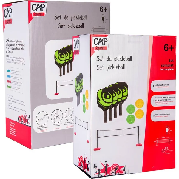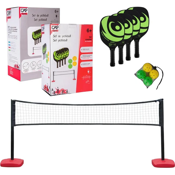 Ensemble complet : tout ce dont vous avez besoin pour vous amuser ! Le set comprend des balles de 26 et de 40 trous, parfaits pour jouer à l’extérieur ou à l’intérieur. Idéal pour débuter. Favorise la coordination et l’esprit d’équipe. Installation rapide : passez plus de temps à jouer, moins de temps à assembler. Terrain polyvalent : s’adapte à toutes les surfaces. Contenu : 4 raquettes en contreplaqué de peuplier, dimensions d’une raquette 20 x 0.8 x 40 cm, 4 balles de Pickleball en plastique (PE) diamètre 7.2 cm (2 de 26 et 2 de 40 trous), et 1 filet de Pickleball (190 x 40 cm). Dimensions du filet assemblé sur pieds : Longueur 190 cm, hauteur 85 cm. Chaque pied a une base à remplir avec de l’eau ou du sable pour assurer la stabilité. Eau et sable non fournis. Instructions d’assemblage du filet imprimées sur la boîte.
