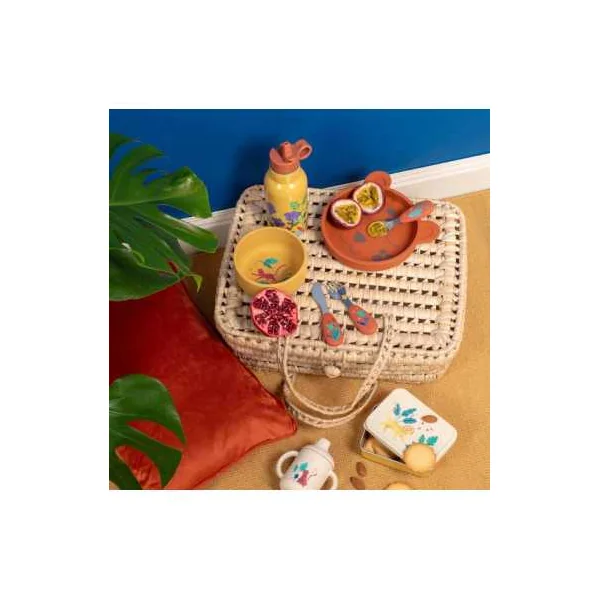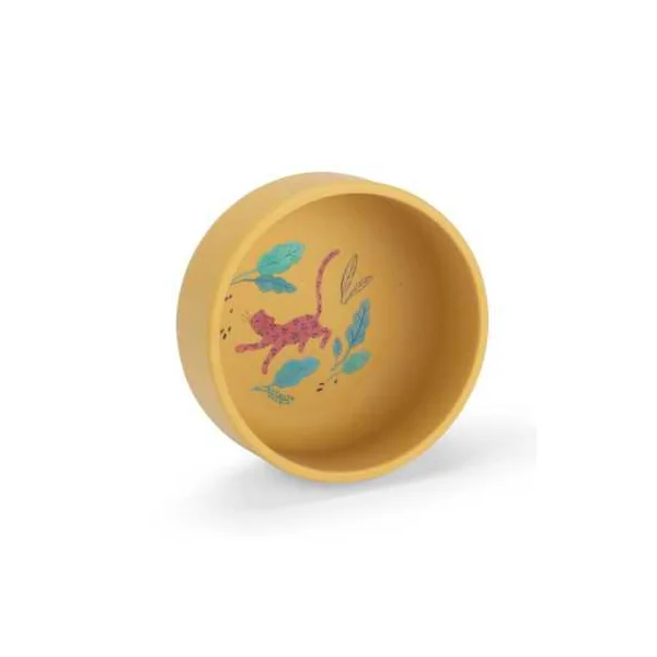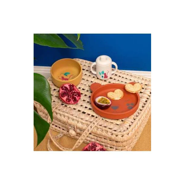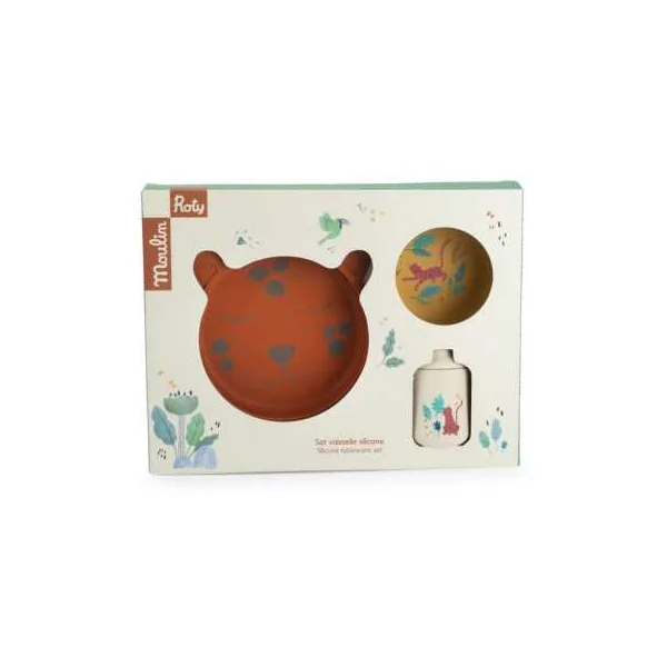 Le set inclut un bol bleu électrique, une tasse à anses jaune et une assiette en forme de léopard, tous décorés de magnifiques illustrations aux couleurs de la collection. Conçu en silicone, ce set est à la fois facile à nettoyer, incassable et idéal pour les petites mains de bébé, tout en rendant les repas plus amusants.