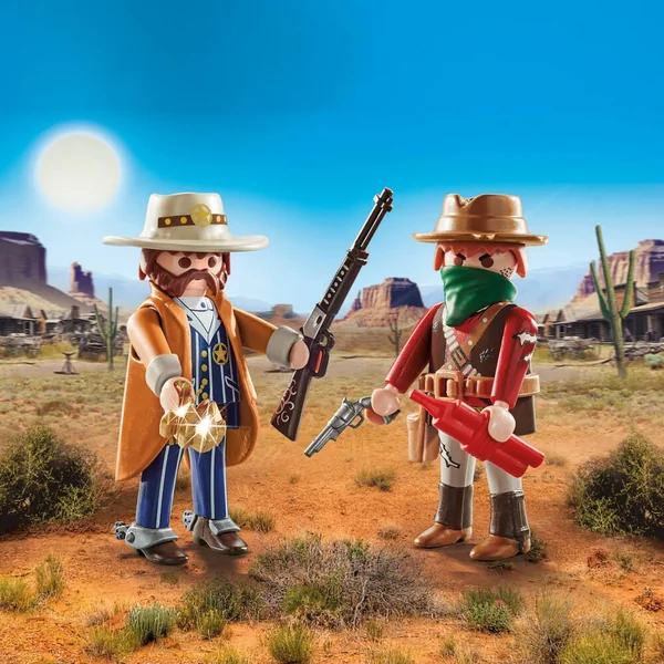 Doublez le plaisir de jouer avec le fantastique DuoPacks PLAYMOBIL : Shérif et bandit. Ce set comprend un shérif avec un chapeau, de l’or et des éperons, ainsi qu’un bandit avec de la dynamite, un pistolet et un bandana.