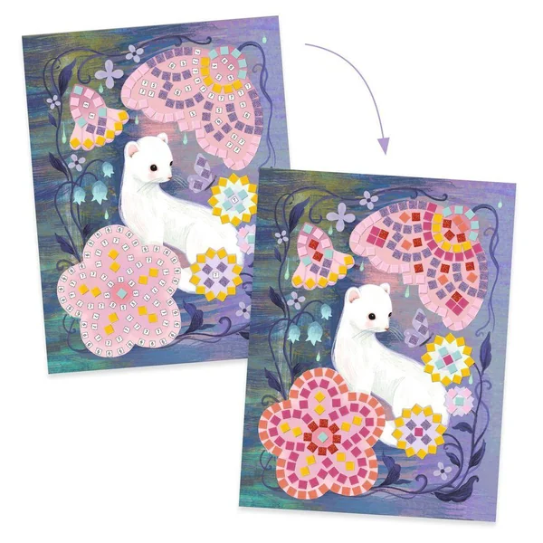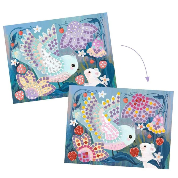 Une activité de collage pour créer des images en mosaïques. Pour faire scintiller ces beaux paysages de sous-bois, l’enfant complète les tableaux avec les petits carrés de mousse adhésive et pailletée en suivant pas-à-pas les indications du livret.