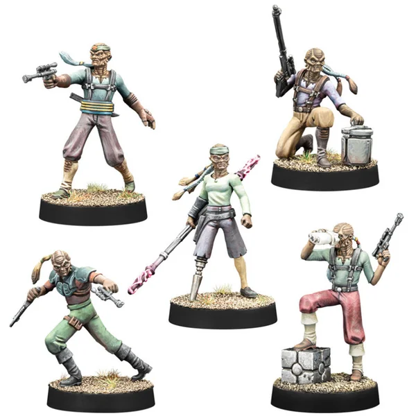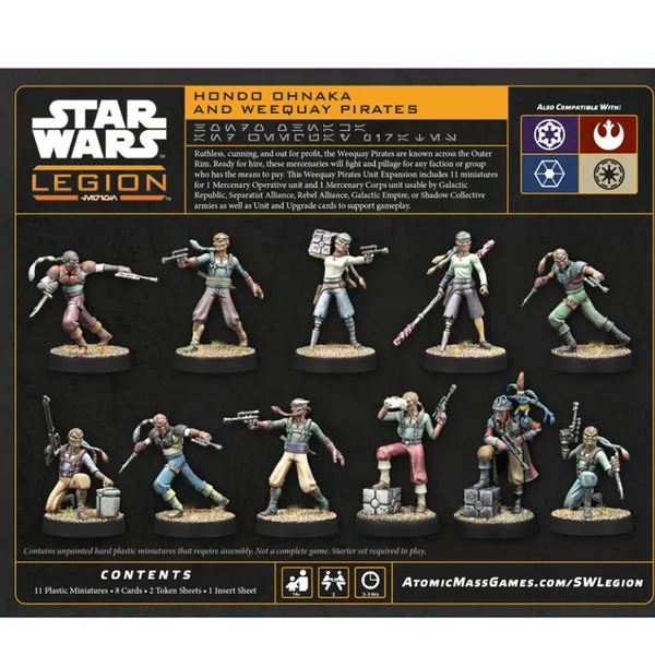 Cette extension contient 10 figurines pour constituer une unité de mercenaires utilisable par la République Galactique, l’Alliance Séparatiste, l’Alliance Rebelle, l’Empire Galactique ou les armées du Collectif de l’Ombre. On y trouve un chef pirate Weequay, six Weequay, des soldats pirates et deux Weequay à armes lourdes, ainsi que cartes Unité et d’Amélioration pour soutenir gameplay. C’est une unité à courte portée qui brille dans le combat au corps à corps.