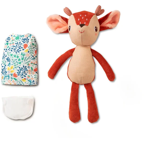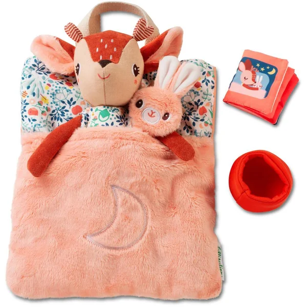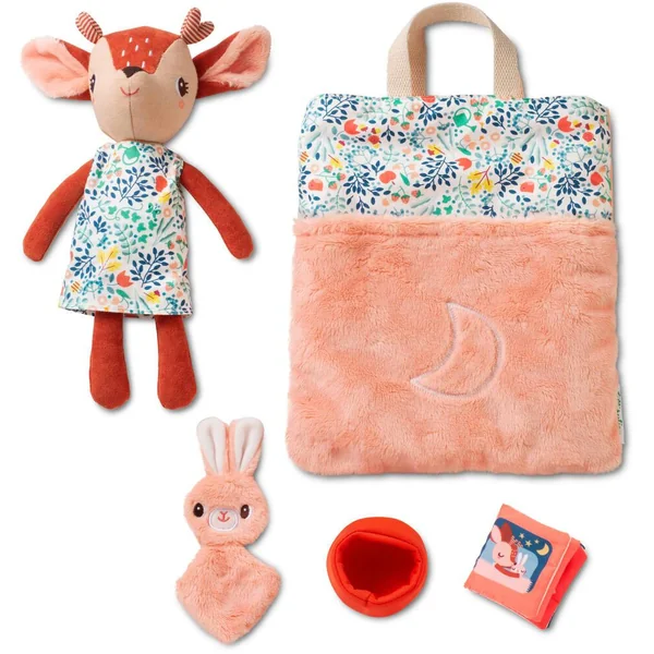 C’est l’heure du dodo! Pouvez-vous aider Stella à se préparer à aller au lit ? Elle va sur le petit pot, enfile sa chemise de nuit, met son lange et s’installe ensuite confortablement avec son doudou dans le petit lit douillet. Après la petite histoire du soir, elle éteint la lampe et ferme ses petits yeux. La lune phosphorescente installée sur son petit lit fait office de veilleuse réconfortante. Expérimentez la routine du soir d’une manière ludique avec Stella. Un ensemble qui apporte sérénité et structure au rituel. Lavable en machine à 30° C – cycle délicat.