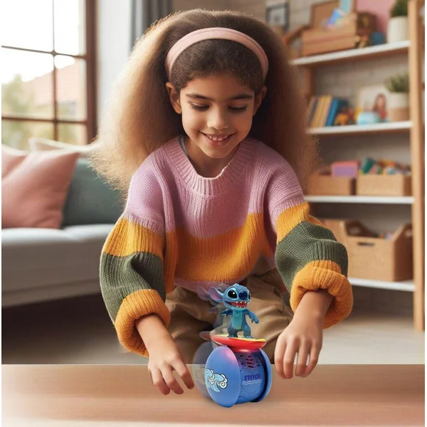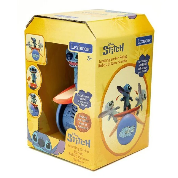 Decouvrez votre nouveau compagnon amusant petit et portable emmenez le partout avec vous effets spectaculaires des sons et lumieres pour encore plus de fun controles interactifs secouez le pour declencher des effets sonores applaudissez pour le controler equilibre etonnant il se tient en equilibre sur une seule roue avec stitch surfeur sur le dessus.