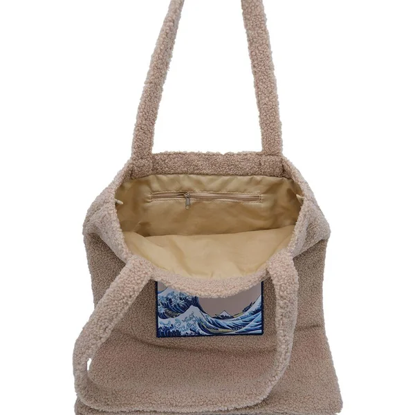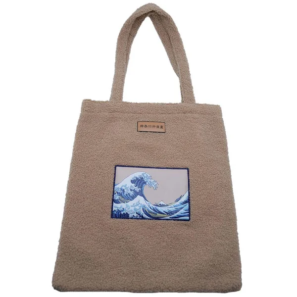 Sac au format shopping bag en matière teddy douce et tendance reprenant la célèbre vague de Kanagawa, représentée au milieu du sac.