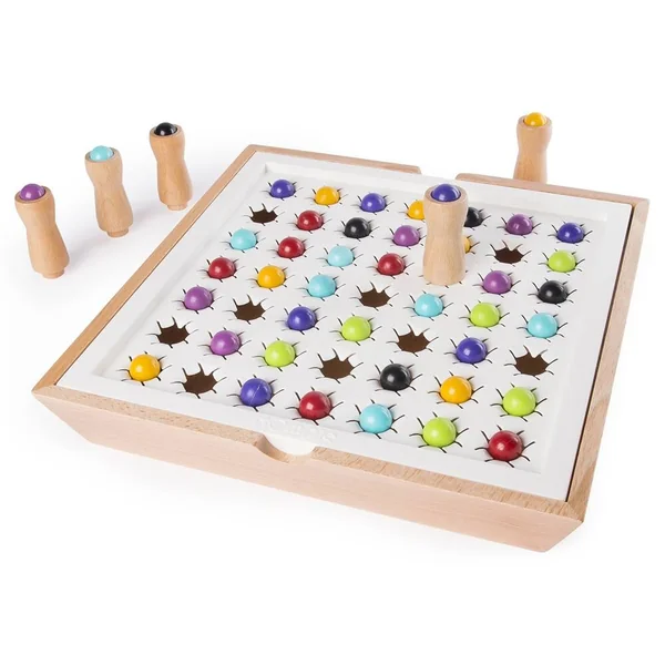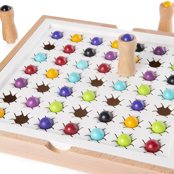 Un jeu convivial avec avec des règles simples. Principe : déplacer son poussoir stratégiquement pour pousser les billes adjacentes dans les trous et isoler ses adversaires. But du jeu : être le premier à atteindre un nombre de points requis en gagnant des manches. Gagner une manche = rester le dernier poussoir en jeu sur le plateau. Bonne re-jouabilité : parties courtes qui s’enchaînent. Peut se jouer à différents niveaux de stratégie. Bel objet et l’expérience de faire tomber les billes est assez addictive. 2 à 6 joueurs. Durée d’une partie : de 10 à 15 minutes.