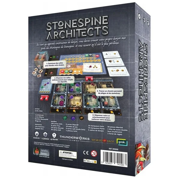 Stonespine Architects est un jeu de drafting de cartes dans lequel 1 à 5 joueurs s’affrontent pour construire le labyrinthe le plus dangereux. Les joueurs piochent et jouent simultanément des cartes pour agrandir leurs donjons, une chambre à la fois.