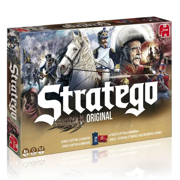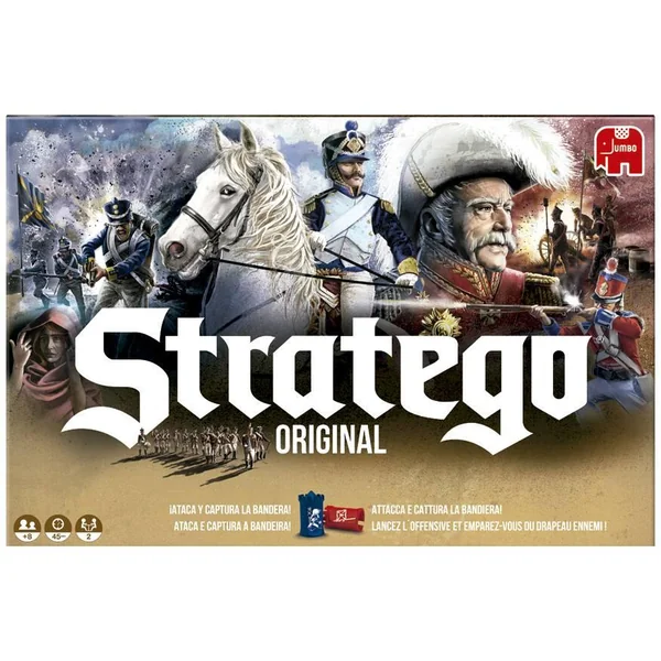 Un des plus grands jeu de stratégie dont le but consiste à s’emparer du drapeau de son adversaire à l’aide d’une armée de 40 personnages de grades différents et d’un infiltré. 3 modes de jeu: duel, Stratego Original et le nouveau mode infiltré. Sois stratégique et lance l’offensive ! Empare-toi du drapeau de ton adversaire sans connaître sa position sur le plateau. Mais n’oublie pas de protéger le tien. Nombre de 2 joueurs. Durée 45 minutes.