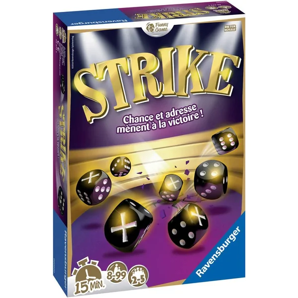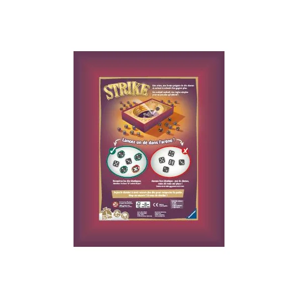 Une arène, une bonne poignée de dés chacun et surtout la volonté d’en gagner plus!Voici le cocktail explosif que Strike nous propose. Lancez votre dé avec dextérité sur ceux déjà présents dans l’arène. Obtenez au moins deux faces identiques et remportez les dés correspondants. Recommencez autant de fois que vous le souhaitez! Stop ou encore ? A vous de décider ! Mais attention : aucune face identique et vos dés restent dans l’arène, une croix et ils sont éliminés ! Remportez tous les dés et le joueur suivant sera obligé de tenter le Grand Lancer ! Qui réussira à rester en lice pour être consacré « Grand vainqueur de l’arène » ?