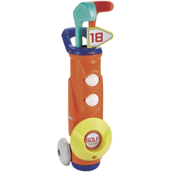 Ce sac de golf à roulettes contient 2 clubs, 2 balles et un trou.