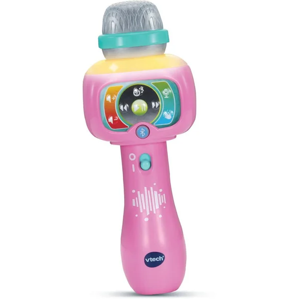 Super micro magic’fun rose – 2 – 5 ans – Un premier micro pour chanter et s’amuser ! L’enfant devient la star de son propre concert ! Il peut chanter et s’amuser à transformer sa voix sur les 15 chansons du micro. Grâce au bouton ‘magic voice’, il peut effacer les paroles et chanter seul. Il peut aussi chanter sur ses chansons préférées en connectant un lecteur MP3 (non inclus) en Bluetooth®. La connexion est sécurisée par code. De nombreux effets supplémentaires : Applaudissements – Musique : pour ajuster le volume sonore et utiliser des effets de transformation de la voix – Effets lumineux : le micro s’illumine et change de couleur au rythme de la musique ou de la voix – Pile de démonstration founies 3 LR03-