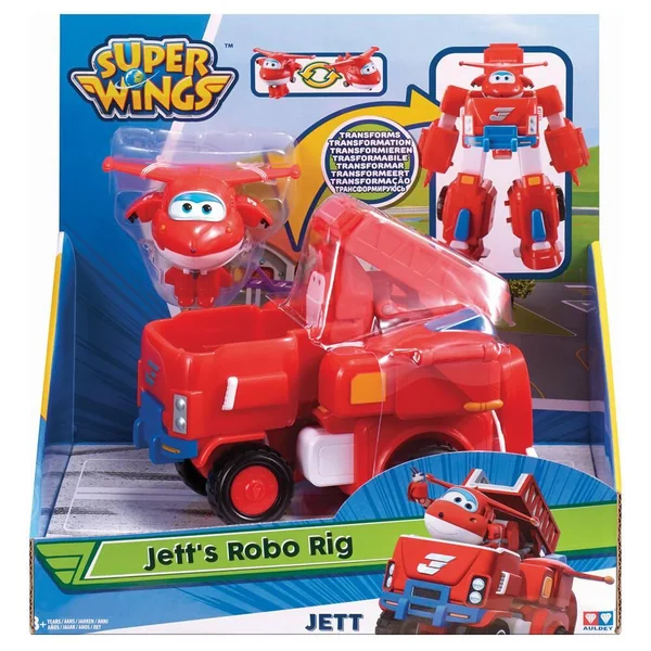 Recrée les missions des Super Wings chez toi grâce au véhicule JETT’S ROBO RIG transformables en robot ! Véhicule JETT’S ROBO RIG à roulettes transformable en un robot articulé de 18 cm de haut. Une échelle se trouve à l’arrière de la tête du robot/du véhicule pour aider les Super Wings à secourir leurs amis pendant les missions• Pratique, la petite figurine transformable Transform’a’bot incluse avec le produit peut se loger en haut du robot ou à l’avant du véhicule pour mener à bien les missions. 1 Figurine transformable.