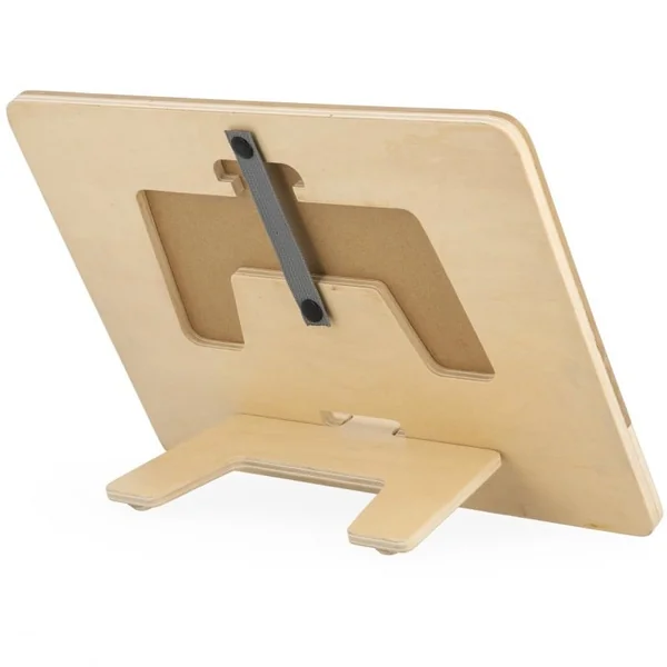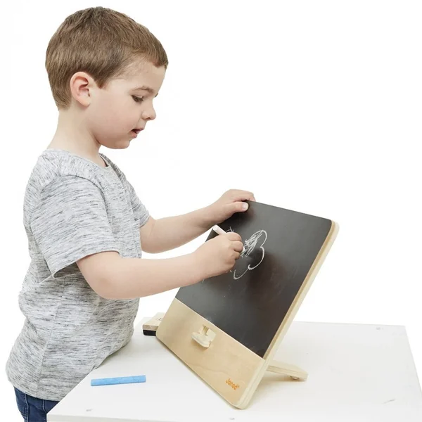 À vos craies les artistes ! Laissez l’imagination de votre enfant prendre vie sur ce joli tableau noir en bois. Doté d’un pied au dos du produit et de patins en silicone qui lui assure plus de stabilité, ce tableau est facile à disposer sur une table ou sur toute autre surface plate. Pour le ranger et le transporter, rien de plus simple ! Le pied se range à l’arrière du tableau, en enlevant l’une des 2 pressions sur la poignée en tissu.