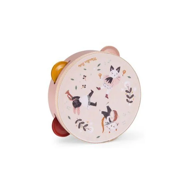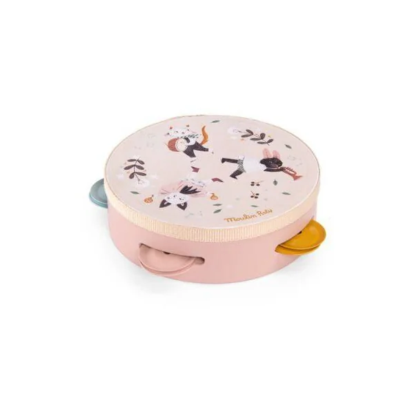 Tambourin 4 cymbales en bois peint, décoré des illustrations poétiques de la collection Après la pluie. Développe le rythme et l’éveil musical des tout-petits, facile à utiliser. 3 et +