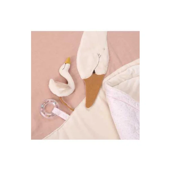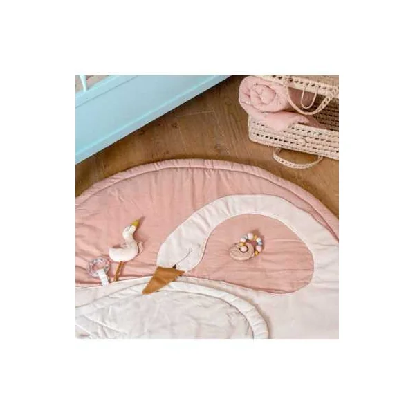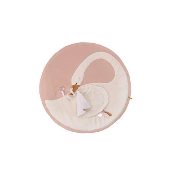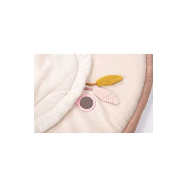 Ce tapis rond molletonné composé de tissus en lin et coton, certifiés OEKO-TEX®, avec de nombreuses activités pour stimuler bébé. Décoré d’un cygne et son petit, il propose des jeux de matières, des sons à découvrir…