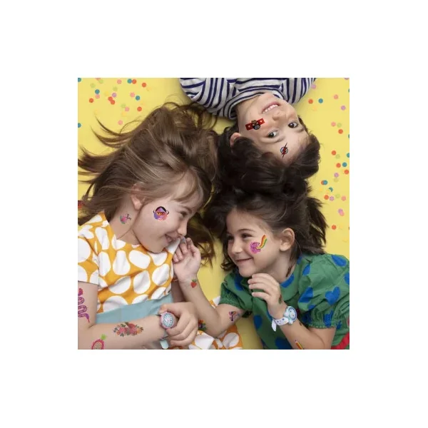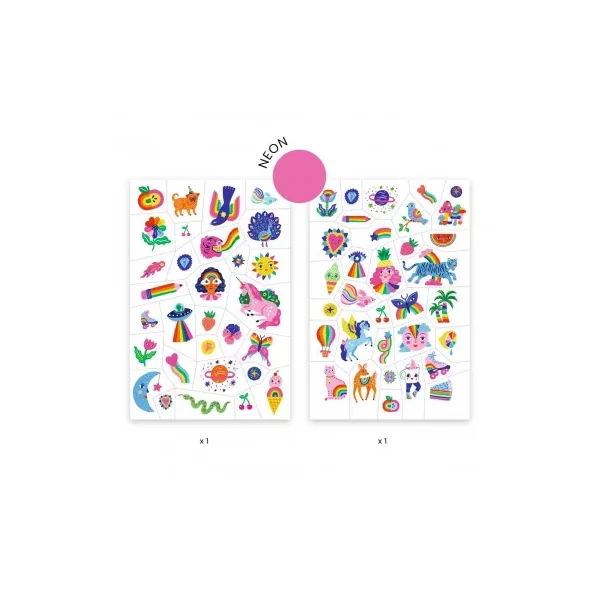 Deux planches de tatouages temporaires aux couleurs de l’arc-en-ciel, des tattoos au style pop avec des détails rose fluo, qui feront le bonheur de vos enfants. Faciles à utiliser, ils sont prédécoupés et s’appliquent avec un peu d’eau. Les planches sont prédécoupées pour détacher facilement les tatouages.