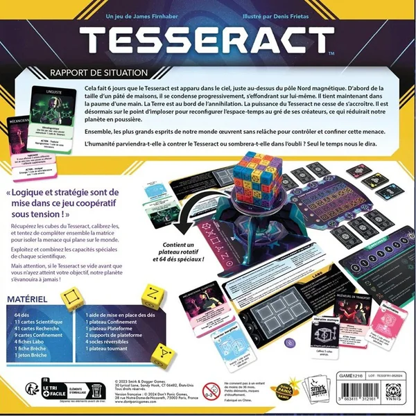 Tesseract est un jeu coopératif où les joueurs et joueuses incarnent des scientifiques. Votre équipe d’exception a été sélectionnée pour tenter de neutraliser le Tesseract. Une fois entièrement amorcé, il déchirerait l’espace-temps, entraînant la destruction de notre monde. Vous réussirez si vous parvenez à confiner 1 cube de chaque couleur et valeur, remplissant les 24 cases du plateau Confinement. Vous échouez si le dernier cube du Tesseract est retiré ou si une 7e brèche se forme.