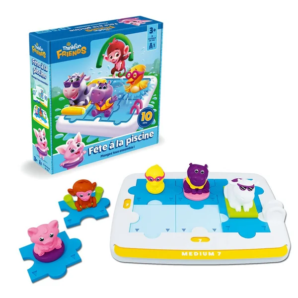 « Fête à la Piscine » fait partie de la gamme de jeux éducatifs ThinkFun & Friends mettant en scène les mêmes personnages attachants dans différentes situations.
